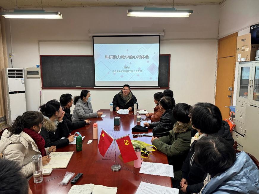 第二阶段由姜晓静和程权杰两位教师分别围绕教学和科研进行重点发言。姜晓静老师结合前段时间参加“路丙辉名师工作室青年教师研修班”学习体会以及自身教学的实际情况,谈到思政课教师尤其是青年思政课教师要站稳讲台、守牢阵地,必须在“备课”“讲课”“养课”上下足硬功夫、练就真本领,积极践行习近平总书记的“六要”指示,做学生喜爱的新时代思政课教师。程权杰老师认为,做科研的过程是苦乐交织的过程。在文献阅读、论文构思以及论文修改等过程中,都需要坐冷板凳、下真功夫。同时,他认为做好科研,要做到“五多”,即多看、多思、多写、多论、多改。与会教师纷纷表示,教学与科研并非“鱼和熊掌”的关系,要通过恰当的方式,实现教学促进科研、科研反哺教学,最终推动二者协同发展,科教融合育人。
