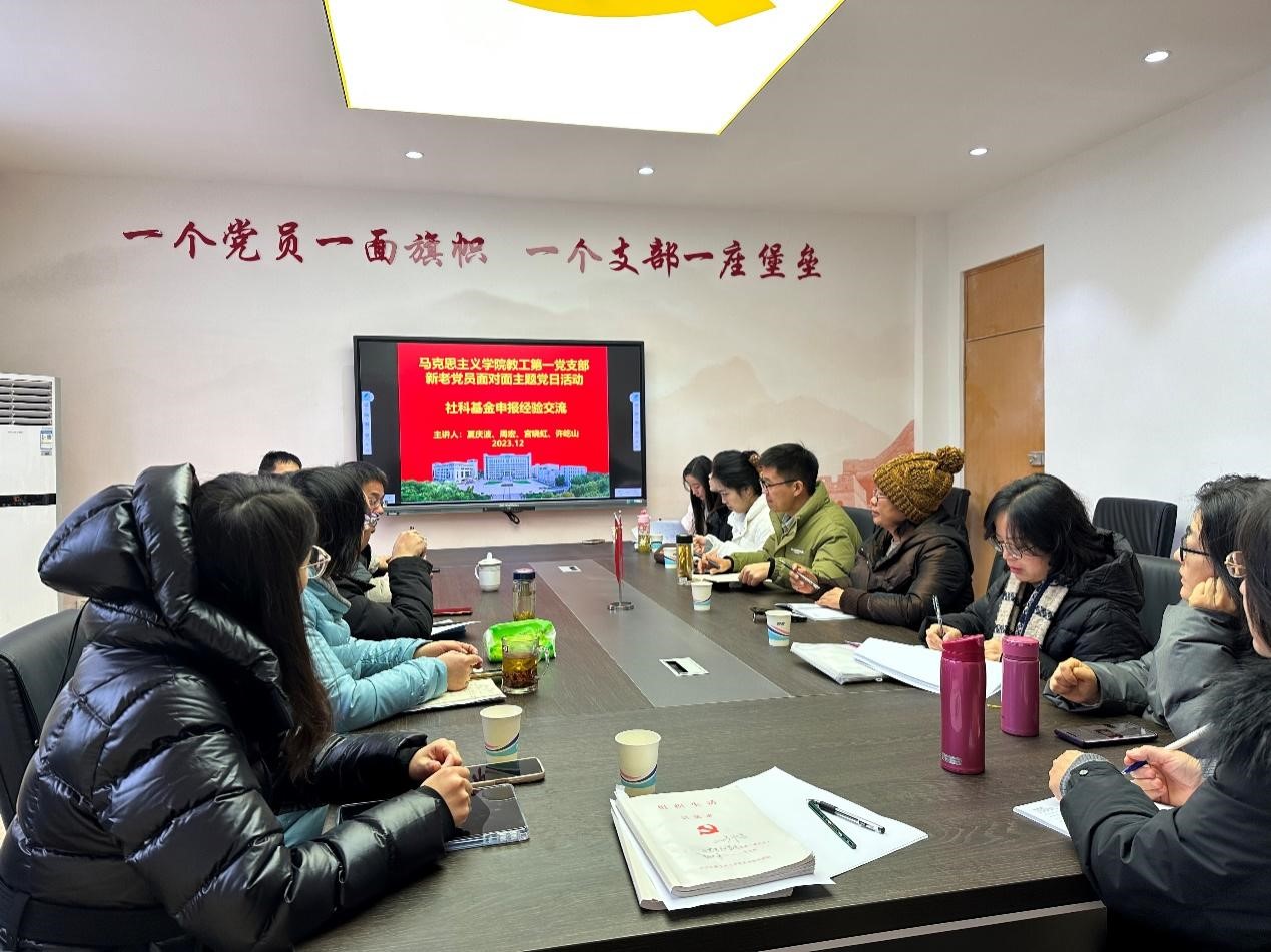 会议分为共话青年教师党员成长发展和国家社科基金申报交流两个阶段。第一阶段主要围绕支部内新进教师党员在教学、科研、生活等方面存在的困惑进行交流。新进教师党员表示,教学上存在深度和广度两方面的问题,深度上如何能够将马克思主义经典作家的著作融入教学,让学生真正的从原著中理解马克思主义;广度上如何能够将最新理论、特色资源更好融入课堂教学都是新进教师党员普遍存在的薄弱点。在科研上,存在着如何提高论文的学理性、逻辑性、创新性,以及学术论文的发表等相应的问题和困惑。