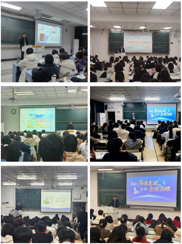 校党委常委、副校长闵凡飞、郑利平、张世宏围绕“践行多边主义 完善全球治理”专题进行授课。他们结合变乱交织的国际形势,阐明凝聚全球治理共识的紧迫性,解读“中国答卷”的智慧担当。张世宏勉励学生胸怀“国之大者”,拓宽全局视野。郑利平结合学校国际交流实践,鼓励学生提升跨文化交流能力,以专业本领服务国家开放大局。