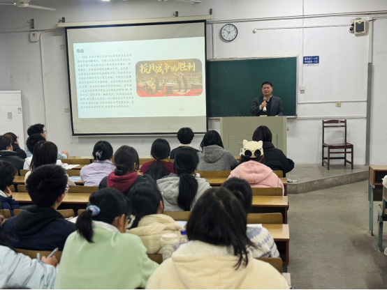 校党委常委、纪委书记吴春雷以中国人民抗日战争的光辉历程为主线,深入阐释了伟大抗战精神在新时代的磅礴力量与时代价值,激励学生赓续红色血脉,从历史中汲取不畏艰难、奋勇争先的精神动力。
