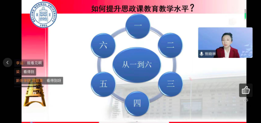 熊晓琳教授作了题为“讲好原理课的思考与实践” 专题辅导报告。熊晓琳教授从“明确定位,夯实基础”“把握标准,突出要求”“全情投入,精心设计”三个方面展开论述。并就如何讲好思政课重点围绕四个方面进行了阐述:一是深耕教材、讲清理论,二是创新方法、用活素材,三是全情投入、以情动人,四是严格自律、知行合一。熊晓琳教授结合自身教学实际,为大家介绍了建设一堂思政课“金课”的经验,即应做到“从一到六”。一是一个红心;二是科研和教学两条腿走路;三是追求讲政治、讲科学、讲故事的“三讲”;四是突出深耕教材,讲清理论、用活教材、创新方法四个基本要求;五是做到用心、用力、用眼、用脑、用情五位一体;六是把握教学设计的六个要素。最后,熊晓琳教授强调必须把讲好思政课当做一项事业来做,鼓励思政课教师要通过日常集体备课活动,将教材体系向教学体系转化,讲好有高度、有深度、有情怀、有温度的思政理论课。