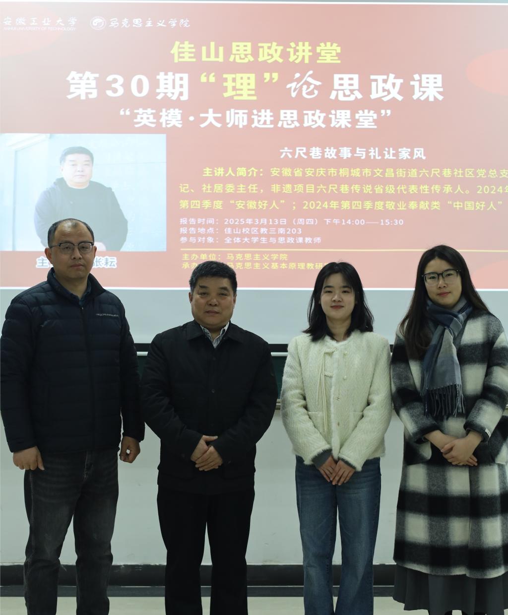 本次报告会邀请非遗项目六尺巷传说省级代表性传承人,2024年第四季度敬业奉献类“中国好人”,安徽省安庆市桐城市文昌街道六尺巷社区党总支书记、社居委主任张耘走进“马克思主义基本原理”课堂,作题为《六尺巷故事与礼让家风》的报告。原理教研室教师倪松根、姚礼巧、张志运用《马克思主义基本原理》中的唯物辩证法解读了礼让家风蕴含矛盾对立统一性、量变质变规律等原理,为同学们理解优秀传统文化的现代价值提供了新的理论维度,也启示大家在生活实践中运用哲学思维,更好地传承和发扬中华优秀传统美德。